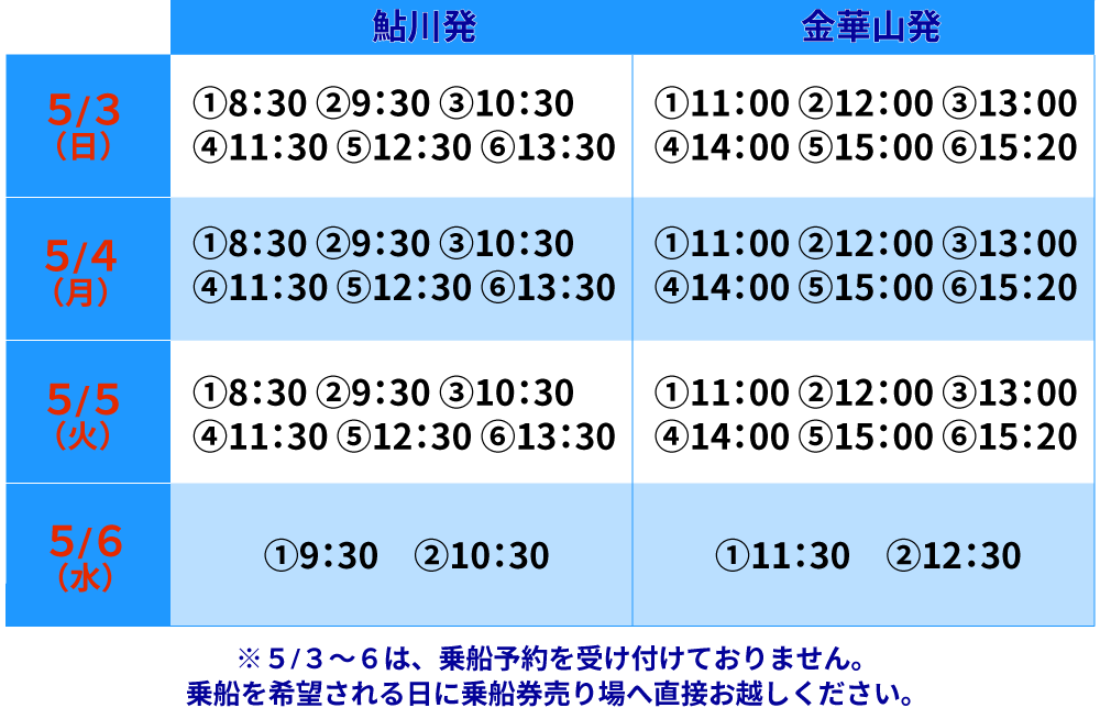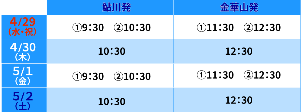 大型連休時は臨時便の運航もしますので、そちらも合わせてご確認ください。