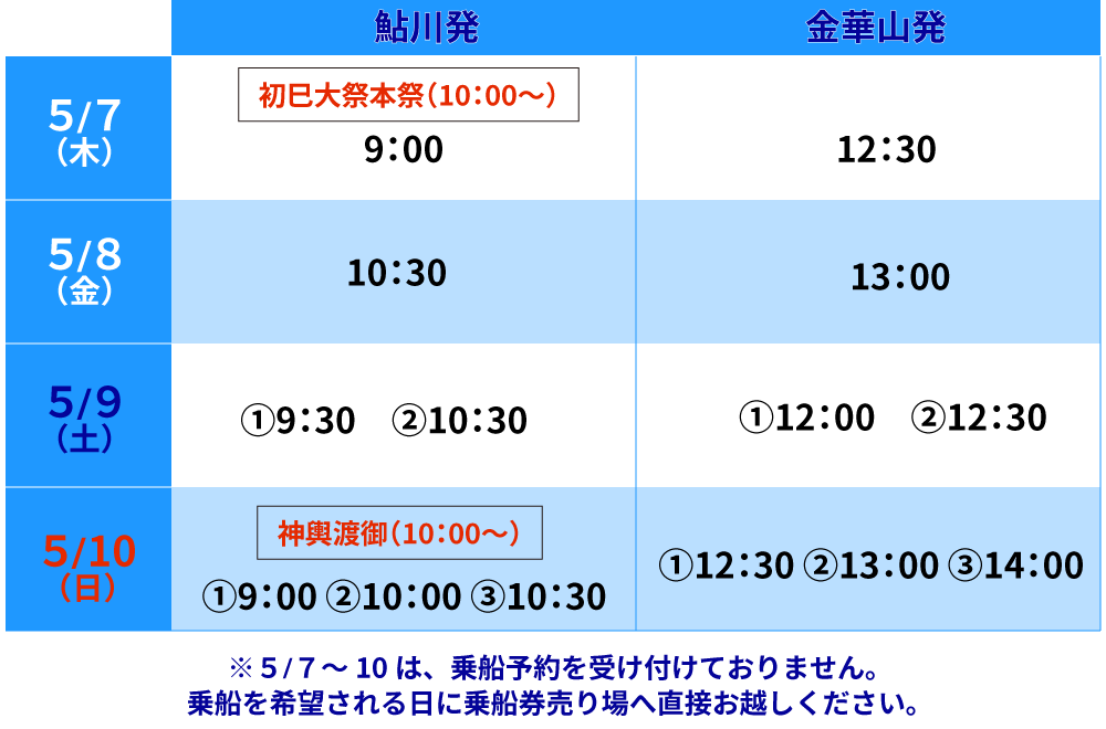 ※天候や季節等によって、運航時刻が変更になる場合があります。詳細については、おしらせもしくは運航カレンダーをご確認下さい。